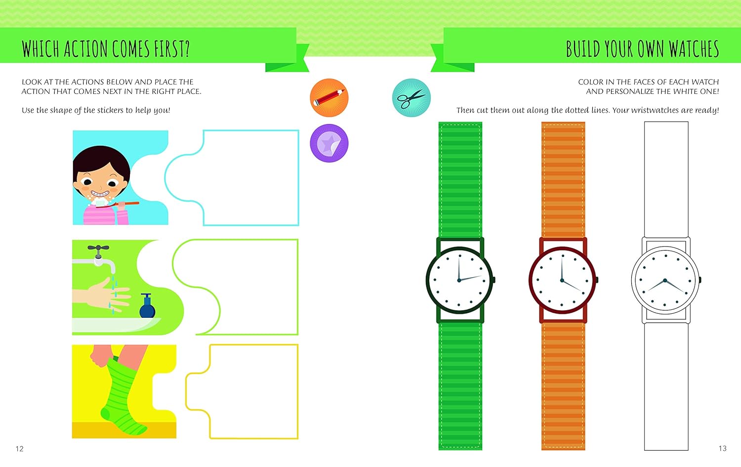The contents follow a progressive complexity to challenge the children to complete various tasks with great results all by themselves. My First Book About Telling Time is dedicated to 3 to 4-year-old children. It leads them through a series of concepts about the passing of time using a variety of fun games. The goal of the book is to stimulate the development of temporal coordinates through phase changes, physical changes and the evolution of moments throughout the day.