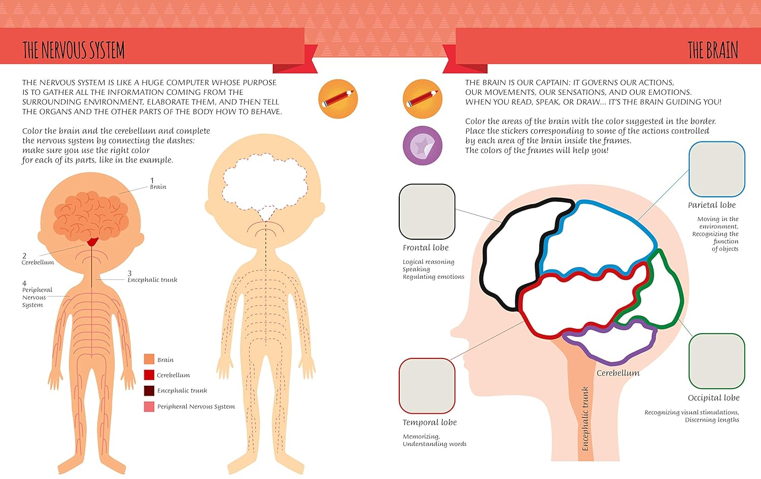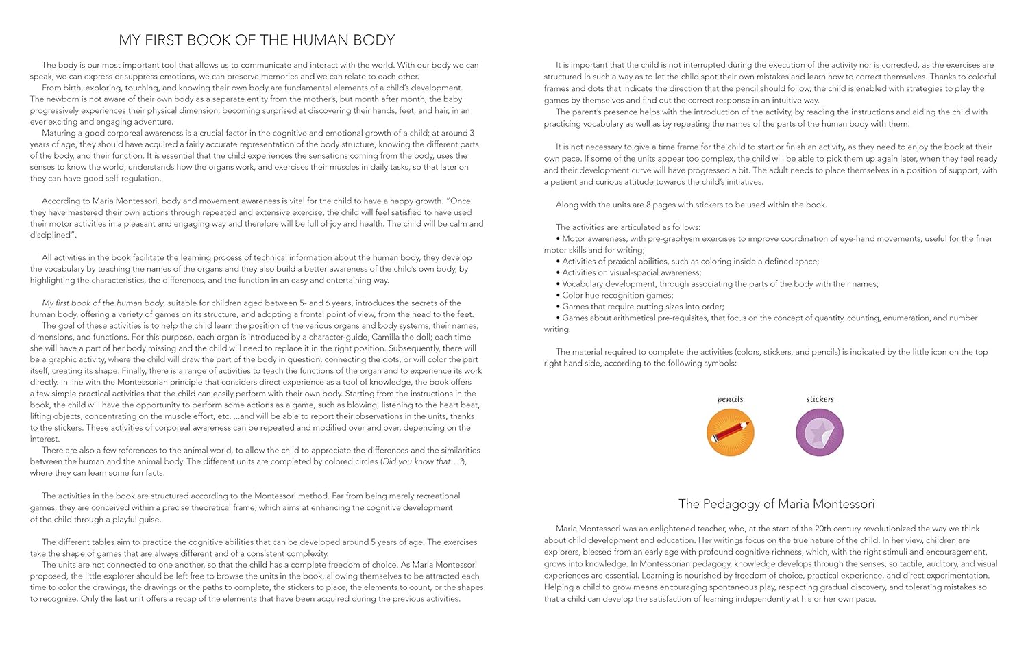 Ce livre, orné de nombreux autocollants fantastiques, est une aventure au cœur des secrets du corps humain et offre un aperçu de sa structure de la tête aux pieds. En utilisant son propre corps, en jouant ou en manipulant les autocollants colorés, l'enfant peut s'amuser grâce à de nombreuses activités simples, toutes inspirées de la méthode Montessori.